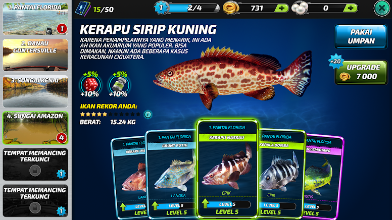 Berbagai pilihan kartu penguat untuk mengoleksi dan meng-upgrade item - tingkatkan pengalaman memancing kamu!
